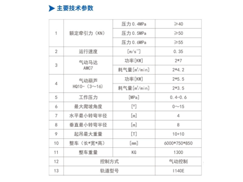 承載小車、連接裝置、氣動葫蘆*2(10 噸)等。